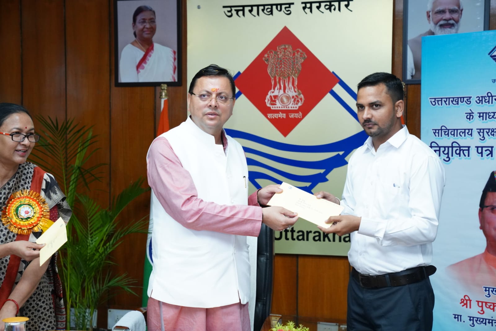 देहरादून l मुख्यमंत्री श्री पुष्कर सिंह धामी ने आज सचिवालय मे उत्तराखण्ड अधीनस्थ सेवा चयन आयोग के माध्यम से चयनित सचिवालय सुरक्षा दल के 15 रक्षकों को नियुक्ति पत्र प्रदान किए। मुख्यमंत्री ने सभी चयनित अभ्यर्थियों को शुभकामनाएं दी और उनके उज्ज्वल भविष्य की कामना की है तथा आशा व्यक्त की सचिवालय सुरक्षा दल के चयनित रक्षक अपनी जिम्मेदारियों का निर्वहन पूरी निष्ठा एवं ईमानदारी से करेंगे। मुख्यमंत्री ने कहा कि उत्तराखण्ड को देश के अग्रणी राज्यों की श्रेणी में लाने के लक्ष्य को पूर्ण करने के लिए हम सबको अपनेअपने कार्यक्षेत्र में सराहनीय कार्य कर प्रदेश के समग्र विकास में योगदान देना होगा। इस अवसर पर अपर मुख्य सचिव श्रीमती राधा रतूड़ी भी उपस्थित थी।
