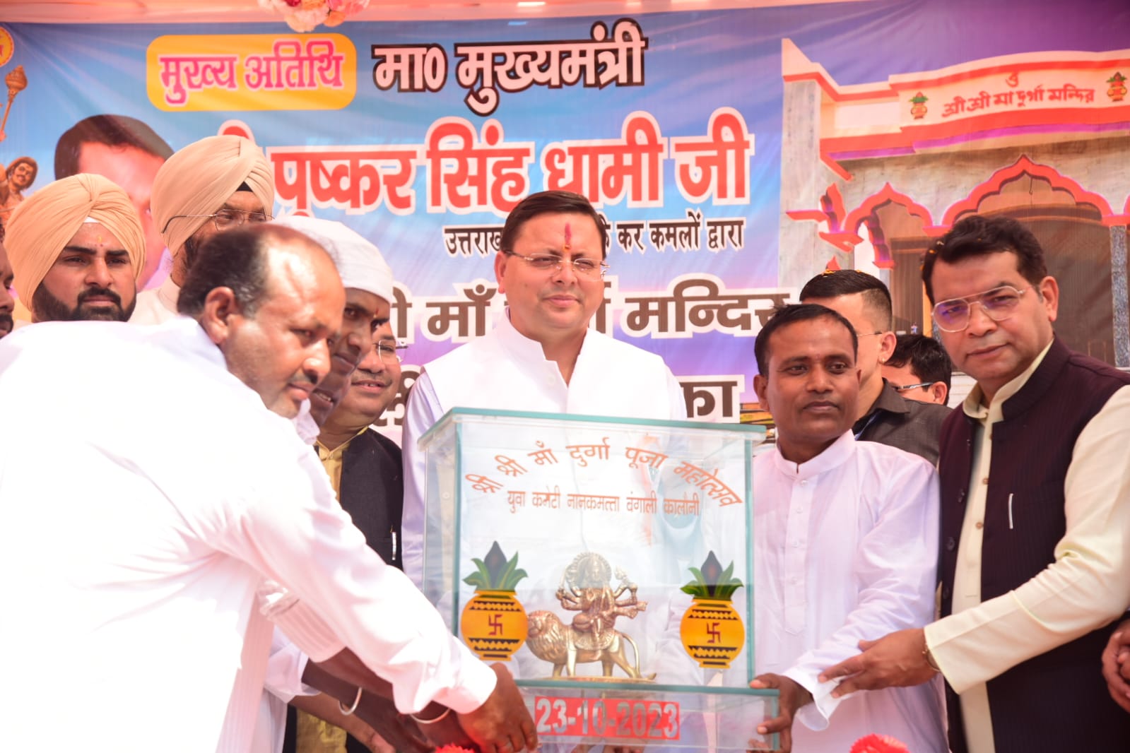 मुख्यमंत्री श्री पुष्कर सिंह धामी ने बंगाली कॉलोनी, नानकमत्ता पहुंचकर श्री श्री मां दुर्गा मंदिर का लोकार्पण किया इस अवसर पर मुख्यमंत्री ने मंदिर के सौंदर्यीकरण, नानकमत्ता क्षेत्र के विकास हेतु मिनी मास्टर प्लान बनाने की भी घोषणा की। मन्दिर परिसर पहुँचने पर क्षेत्रवासियों ने मुख्यमंत्री पुष्कर सिंह धामी को स्मृति स्वरूप दुर्गा माता की प्रतिमा भेंट की। मुख्यमंत्री श्री धामी ने सभी को भक्ति और शक्ति के प्रतीक दुर्गा महोत्सव, शारदीय नवरात्र, विजयादशमी, भैया दूज, गोवर्धन पूजा, रामनवमी की हार्दिक बधाई एवं शुभकामनाएं दी। श्री धामी ने कहा कि यह उनका सौभाग्य है कि आज उन्हें मां दुर्गा के इस भव्य मंदिर का उद्घाटन कर प्रदेशवासियों के लिए खुशहाली की कामना करने का सुअवसर प्राप्त हुआ है। उन्होंने बंगाली समाज का हृदय की गहराइयों से आभार व्यक्त किया। उन्होंने स्वामी विवेकानंद, गुरुदेव रवींद्रनाथ टैगोर, बंकिम चंद्र चट्टोपाध्याय, राजा राम मोहन राय सहित बंगाल के महान सपूतों को नमन किया, जिन्होंने समाज को एक नई राह दिखाई। मुख्यमंत्री ने कहा कि बंगाल की भूमि से निकले महान व्यक्तित्वों ने जब जैसी आवश्यकता पड़ी तब शस्त्र और शास्त्र से, त्याग और तपस्या से मां भारती की सेवा की है। उन्होंने कहा कि चेतना हो या अध्यात्म, विज्ञान हो या कला और संस्कृति हर क्षेत्र में बंगाल ने देश को प्रगति की राह दिखाई तथा पूरी दुनिया में भारत का नाम रोशन किया। उन्होंने कहा कि दुर्गा पूजा का पर्व भारत की एकता और पूर्णता का पर्व भी है। बंगाल की दुर्गा पूजा भारत की इस पूर्णता को एक नई चमक देती है, नए रंग देती है, नया श्रृंगार देती है। ये बंगाल की जागृत चेतना का, बंगाल की आध्यात्मिकता का, बंगाल की ऐतिहासिकता का प्रभाव है। मुख्यमंत्री ने कहा कि प्रधानमंत्री श्री नरेंद्र मोदी के नेतृत्व में देश में महिलाओं के सशक्तिकरण का अभियान जारी है। तीन तलाक के खिलाफ कानून हो या फिर जनधन योजना में महिलाओं के नाम से खाते हो, स्वच्छ भारत के तहत शौचालय का निर्माण हो या फिर हर घर में रसोई गैस के सिलेंडर पहुंचाना हो, महिला आरक्षण हो या फिर महिला सुरक्षा की बात हो, सरकार ने महिलाओं के सशक्तिकरण के लिए व्यापक स्तर पर कार्य किए हैं। बेटी के जन्म से लेकर महिलाओं की सुरक्षा तक के लिए सरकार सजग है। उन्होंने आदि कैलाश, गुंजी और जागेश्वर सहित उत्तराखंड के सीमांत क्षेत्र में आकर मानसखंड को वैश्विक स्तर पर पहचान दिलाने के लिए प्रधानमंत्री का आभार व्यक्त किया। मुख्यमंत्री ने कहा कि उत्तराखण्ड में रहने वाले हमारे बंगाली परिवारों की अर्से से कई मांगें लंबित थी, जिसे हमारी सरकार ने पूरा करने का काम किया है। उन्होंने कहा कि बंगाली समाज के बच