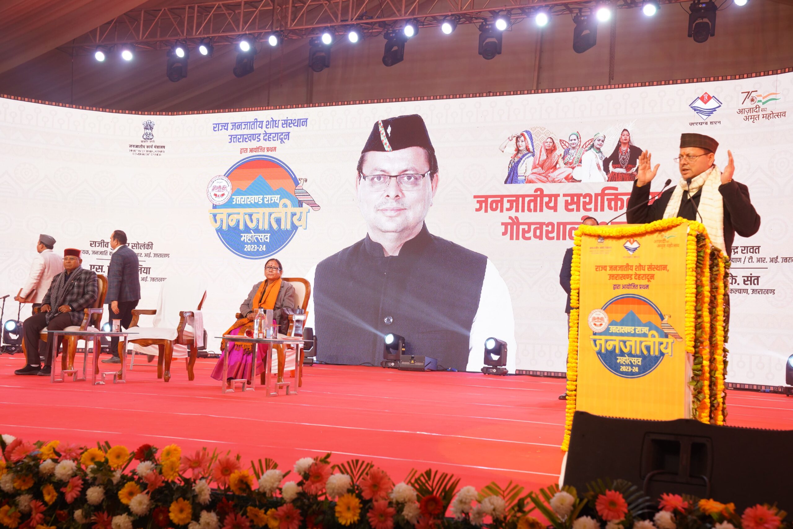 मुख्यमंत्री श्री पुष्कर सिंह धामी ने आज देहरादून के परेड मैदान में राज्य जनजातीय शोध संस्थान की ओर से आयोजित जनजातीय महोत्सव में प्रतिभाग किया। इस अवसर पर मुख्यमंत्री ने सभी को कार्यक्रम के आयोजन की शुभकामनाएं प्रदान करते हुए कहा कि भगवान बिरसा मुंडा जी ने आदिवासी समाज के लिए अस्तित्व, अस्मिता और आत्मनिर्भरता का जो मंत्र दिया था उसका आज संपूर्ण देश में आदरणीय प्रधानमंत्री श्री नरेन्द्र मोदी जी के नेतृत्व में अक्षरशः पालन किया जा रहा है। मुख्यमंत्री ने कहा कि हमें यह याद रखना होगा कि पेड़ चाहे जितना भी विशाल हो, लेकिन वह तभी अपना सीना ताने खड़ा रह सकता है, जब उसकी जड़ें मजबूत हों और जनजातीय समाज हमारे वटवृक्ष रूपी देश की मजबूत जड़ के समान है। इसलिए हमारी डबल इंजन की सरकार का मानना है कि जनजातीय समाज का मजबूत और आत्मनिर्भर बनना देश और प्रदेश की उन्नति के लिए बहुत आवश्यक है। मुख्यमंत्री ने कहा कि भारत के स्वतंत्रता संग्राम में जनजातीय समाज के योगदान को कौन भूल सकता है। उन्होंने कहा कि इस योगदान का स्मरण करते हुए पिछले वर्ष आदरणीय प्रधानमंत्री जी ने प्रत्येक वर्ष की 15 नवंबर को जनजातीय गौरव दिवस के रूप में मनाये जाने की घोषणा की थी। जिसे हमारी सरकार द्वारा भी हर वर्ष अत्यंत धूमधाम से मनाया जा रहा है और भविष्य में भी मनाया जाएगा। मुख्यमंत्री ने कहा कि आज का यह जनजातीय महोत्सव जहां एक ओर जनजातीय कलाकारों को अपनी प्रतिभा प्रदर्शित करने का अवसर प्रदान कर रहा है, वहीं गैर जनजातीय समुदाय को भी जनजातीय समाज की कला एवं संस्कृति की विशेषताओं से अवगत कराने का कार्य भी कर रहा है। उन्होंने कहा कि आज तक जनजातीय समाज के राष्ट्र निर्माण में किए गए योगदान की जानकारी से देश को अंधेरे में रखा गया और अगर बताया भी गया तो बहुत ही सीमित दायरे में बताया गया, पर आज आदरणीय मोदी जी के नेतृत्व में हमारा देश जाग चुका है और अब कोई भी इसकी संस्कृति और इतिहास के साथ खिलवाड़ नहीं कर सकता। मुख्यमंत्री ने कहा कि हमने आजादी के नायकों की भूली बिसरी वीर गाथाओं को देश के सामने लाना है, यह हमारा कर्तव्य है और हम आदिवासियों द्वारा किए गए महान बलिदानों को कभी नहीं भूल सकते। मुख्यमंत्री ने कहा कि वर्ष 2014 से पहले सरकारों में आदिवासी समाज को आगे बढ़ाने के लिए आवश्यक राजनैतिक इच्छाशक्ति की कमी थी, उन्होंने आदिवासी समाज के व्यावसायिक हितों पर कोई ध्यान नहीं दिया। यह सरकारें दिखावे तक ही आदिवासी समाज के विकास की बात लिया करती थी, परंतु 2014 के बाद से देश में आदरणीय प्रधानमंत्री श्री मोदी जी के नेतृत्व वाली सरकार ने आदिवासी समाज के धरातल पर विकास के लिए नूतन प्रयोग किए। आज चाहे शिक्षा का क्षेत्र हो या चिकित्सा का क्षेत्र हो 