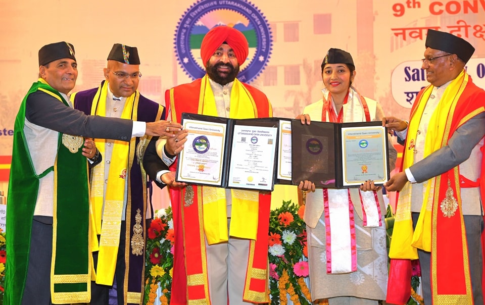 राज्यपाल Lt Gen Gurmit Singh ने आज उत्तराखण्ड मुक्त विश्वविद्यालय, हल्द्वानी के नवम दीक्षांत समारोह में मुख्य अतिथि के रूप में प्रतिभाग कर 20 शिक्षार्थियों को विश्वविद्यालय स्वर्ण पदक, 02 शिक्षार्थियों को कुलाधिपति स्वर्ण पदक, 13 छात्रों को पीएचडी की उपाधि प्रदान की एवं 03 शिक्षार्थियों को प्रायोजित स्वर्ण पदक प्रदान किए। विश्वविद्यालय द्वारा वर्ष 2023-24 शैक्षिक सत्र के विभिन्न शाखाओं के 17084 शिक्षार्थियों की उपाधियां डिजिलॉकर पर लाइव की गई। इस अवसर पर डॉ. हेमचन्द्र को डी.लिट की मानद उपाधि से सम्मानित किया।