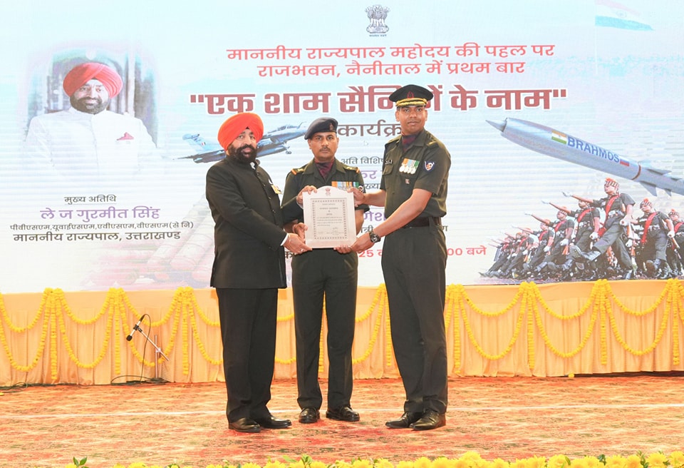 राज्यपाल Lt Gen Gurmit Singh ने आज राजभवन नैनीताल में सैनिक कल्याण विभाग द्वारा आयोजित ‘‘एक शाम सैनिकों के नाम’’ कार्यक्रम में प्रतिभाग किया। इस अवसर पर राज्यपाल ने वीरता पदक विजेताओं और सराहनीय कार्य करने वाले पूर्व सैनिकों को सम्मानित किया। कार्यक्रम में अर्धसैनिक बल के जवानों और अधिकारियों को राज्यपाल द्वारा प्रशंसा पत्र भी प्रदान किए गए। कार्यक्रम को संबोधित करते हुए राज्यपाल ने कहा कि उत्तराखण्ड वीरों की भूमि है, जिसे ‘देवभूमि’ के साथ-साथ ‘वीरभूमि’ भी कहा जाता है। यहां अनेक वीर सपूतों ने देश की रक्षा के लिए अपना सर्वोच्च बलिदान दिया है। उन्होंने कहा कि उत्तराखण्ड का भारतीय सेनाओं में योगदान लगभग 18 प्रतिशत है, जो दर्शाता है कि यह राज्य वास्तव में देश की रक्षा की एक मजबूत रीढ़ है। देश पर बलिदान होने वाले हर पाँचवें सैनिक का उत्तराखण्ड से होना, यह कोई संयोग नहीं, बल्कि इस राज्य की रगों में दौड़ता राष्ट्र प्रेम है। उन्होंने कहा कि आज का यह कार्यक्रम हमारे उन वीरों के प्रति कृतज्ञता व्यक्त करने का एक छोटा सा प्रयास है। यह हमारे सैनिकों और उनके परिवारों को संदेश देता है कि उनका बलिदान न केवल हमारे लिए अमूल्य है, बल्कि आने वाली पीढ़ियों के लिए प्रेरणा का स्रोत भी है।