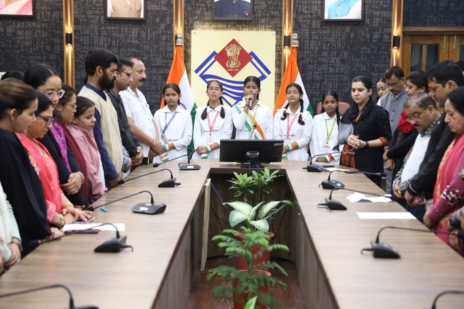 देहरादून। भारत वर्ष के राष्ट्रगीत ‘‘वंदे मातरम्’’ के 150 वर्ष पूर्ण होने के अवसर जनपद के सभी सरकारी, गैर सरकारी कार्यालयों, शिक्षण संस्थानों एवं सामाजिक संगठनों में प्रातः 10 बजे ‘‘वंदे मातरम्’’ का गायन किया गया। जिलाधिकारी सविन बंसल के दिशा निर्देशन में जिला कार्यालय में उप जिलाधिकारी अपूर्वा सिंह की मौजूदगी में क्लेक्ट्रेट परिसर के समस्त अधिकारियों, कार्मिकों एवं श्री गोर्वधन सरस्वती विद्या मंदिर की छात्राओं की उपस्थिति में वंदे मातरम् का सामूहिक गायन किया गया। इस मौके पर देशभक्ति से ओत-प्रोत वातावरण में अधिकारीगण, कार्मिक, शिक्षक, विद्यार्थी सभी उत्साहपूर्वक शामिल हुए।